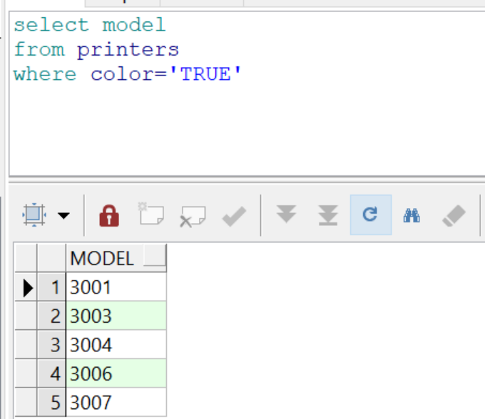 INSERT INTO printers (model, color, ptype, price) VALUES ('3007', 'TRUE', 'laser', 200);CREATE TABLE products (