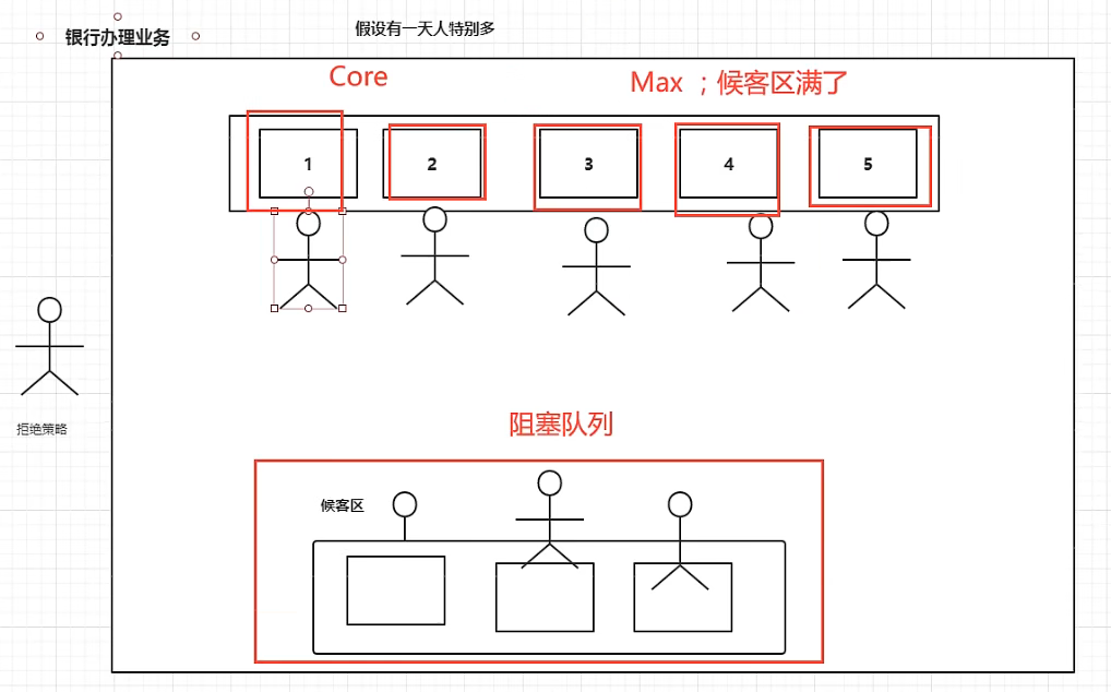 - new ThreadPoolExecutor.AbortPolicy() //线程满了还有线程要进入则,不做处理,直接抛出异常