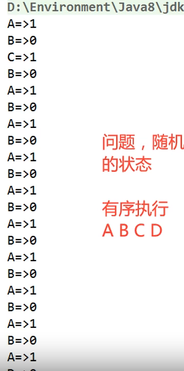 import java.util.concurrent.locks.ReentrantLock;public class B {public static void main(String[] args) {Data01 data01 = new Data01();new Thread(() -> {for (int i = 0; i < 10; i++) {data01.printA();}}, "A").start();new Thread(() -> {for (int i = 0; i < 10; i++) {data01.printB();}}, "B").start();new Thread(() -> {for (int i = 0; i < 10; i++) {data01.printC();}}, "C").start();new Thread(() -> {for (int i = 0; i < 10; i++) {data01.printD();}}, "D").start();}