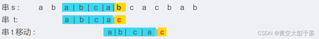 当串 s 和 串 t 元素进行比较时 , 当一个字符不匹配的时候 , 我们必然要让 串 t 开头 往后移动