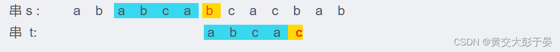 上图, 标蓝 部分 , 我们在我们在对比的时候已经对比过了 , 我们会发现 串 t 里面有两个头节点 , 那当我对比到 第二个头结点之后的一个节点的时候 , 我们如果发现不同字符 , 我们就可以把第二个头结点当作头结点, 然后后续接着让 串 t 的第二个节点和 串 s 进行比较