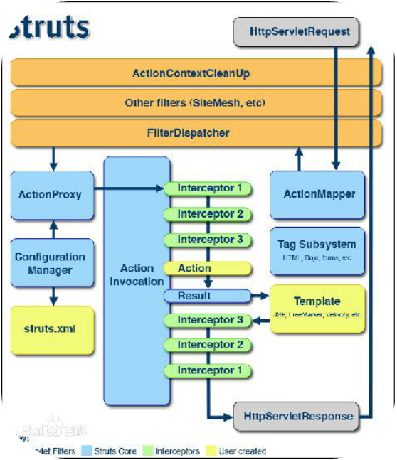 当Web容器收到请求(HttpServletRequest)它将请求传递给一个标准的的过滤链包括(ActionContextCleanUp)过滤器。经过Other filters(SiteMesh ,etc),需要调用FilterDispatcher核心控制器,然后它调用ActionMapper确定请求哪个Action,ActionMapper返回一个收集Action详细信息的ActionMaping对象。FilterDispatcher将控制权委派给ActionProxy,ActionProxy调用配置管理器(ConfigurationManager) 从配置文件中读取配置信息(struts.xml),然后创建ActionInvocation对象。