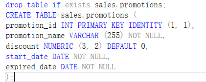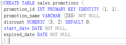 在sales模式中创建了一个名为promotions的新表。 promotions表有五列,包括:促销标识号 (promotion_id),名称(name),折扣(discount),开始日期(start_date)和过期日期 (expired_date)。 promotion_id是标识列,因此当向表中添加新行时,SQL Server会自动填充其值。