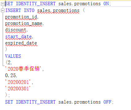 通常,不为标识列指定值,因为SQL Server将自动提供值。但是,在某些情况下,可能希望在标识列中 插入值,例如数据迁移 要为标识列插入显式值,必须首先执行以下语句:SET IDENTITY_INSERT table_name ON; 要关闭标识插入,请使用类似的语句:SET IDENTITY_INSERT table_name OFF; 在 promotion 表中插入标识列的值: