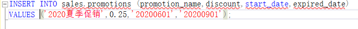 在此示例中,为 promotions 表中的四列指定了值。但没有为 promotion_id 列指定值,因为SQL Server会自动为此列提供值。 如果 INSERT 语句成功执行,将返回插入的行数。