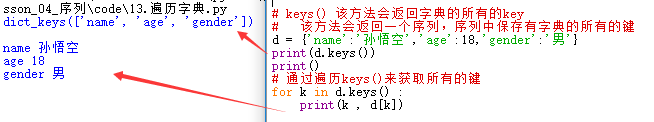 # keys() 该方法会返回字典的所有的key # 该方法会返回一个序列,序列中保存有字典的所有的键 d = {'name':'孙悟空','age':18,'gender':'男'} print(d.keys()) print() # 通过遍历keys()来获取所有的键 for k in d.keys() :print(k , d[k])