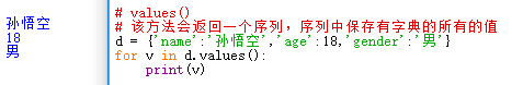 # values() # 该方法会返回一个序列,序列中保存有字典的所有的值 d = {'name':'孙悟空','age':18,'gender':'男'} for v in d.values():print(v)