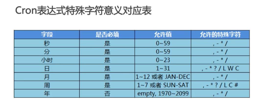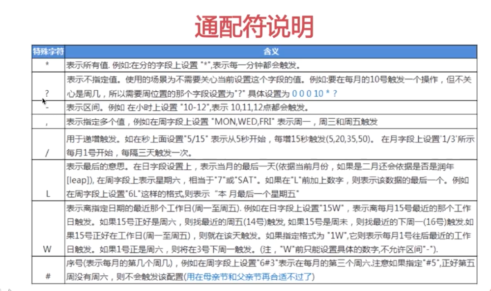 CronTrigger配置格式: 格式: [秒] [分] [小时] [日] [月] [周] [年] 序号说明 是否必填 允许填写的值允许的通配符 1 秒 是 0-59 , - * / 2 分 是 0-59 , - * / 3小时 是 0-23 , - * / 4 日 是 1-31 , - * ? / L W 5 月 是 1-12 or JAN-DEC , - * / 6 周 是 1-7 or SUN-…