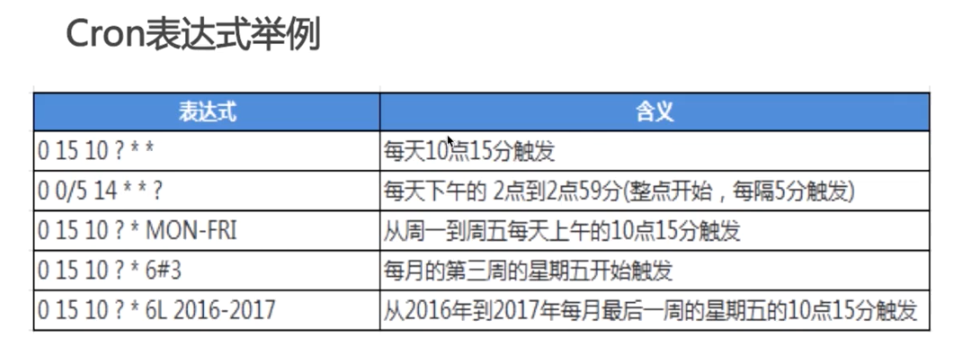 Cron表达式 简单触发可以使用SimplTrigger实现类.功能类似timer 复杂触发可以使用CronTrigger实现类,内部利用cron表达式描述各种复杂的时间调度计划 举例 表示2022年9月3日凌晨4点的cron表达式 0 0 4 3 9 ? 2022 * 表示任何值,如果在分的字段上编写*,表示每分钟都会触发 …