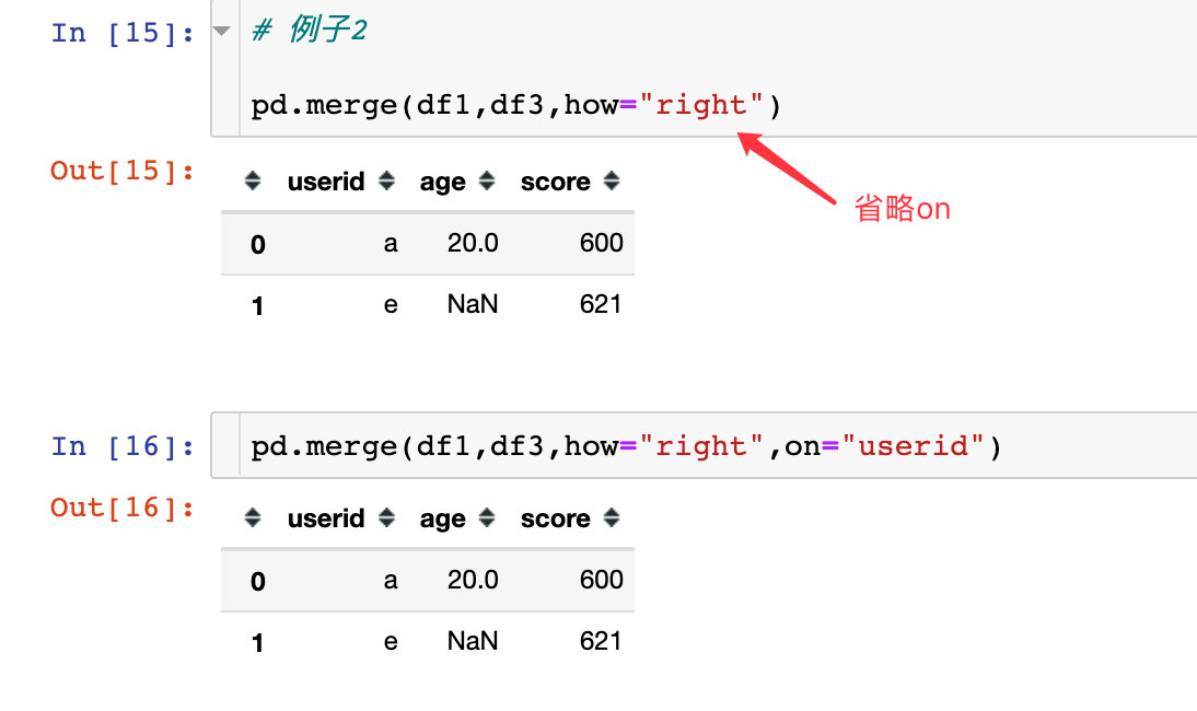 - 当how=“right”,只会保留df3(right)中userid的全部取值