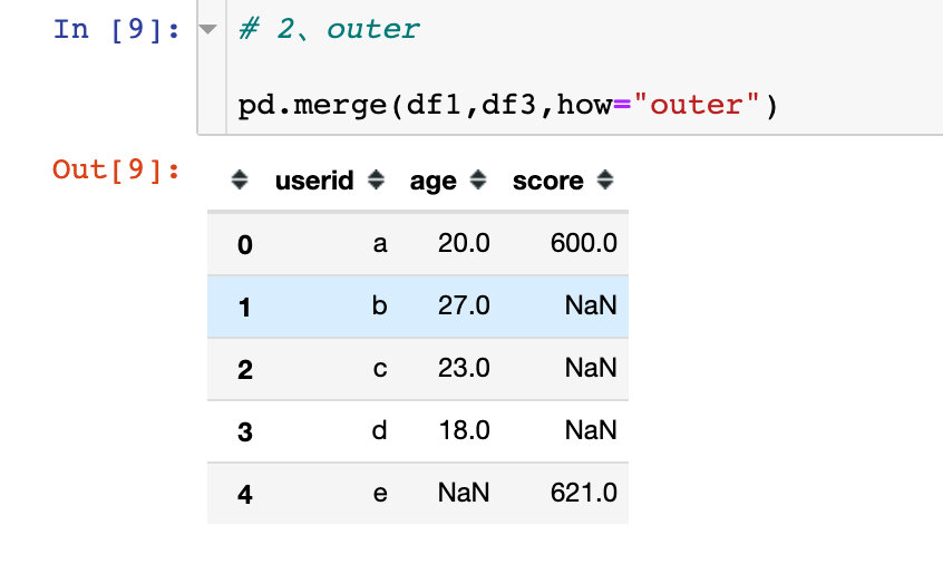 - 使用how=“outer”,会保留两个数据框中的全部数据。某个数据框中不存在键的值,则取NaN