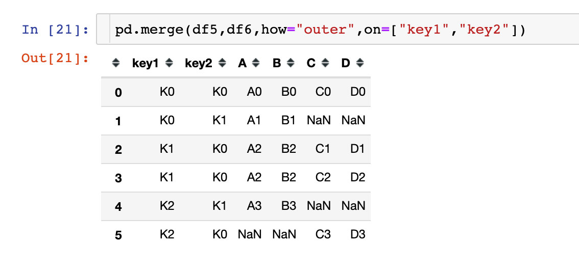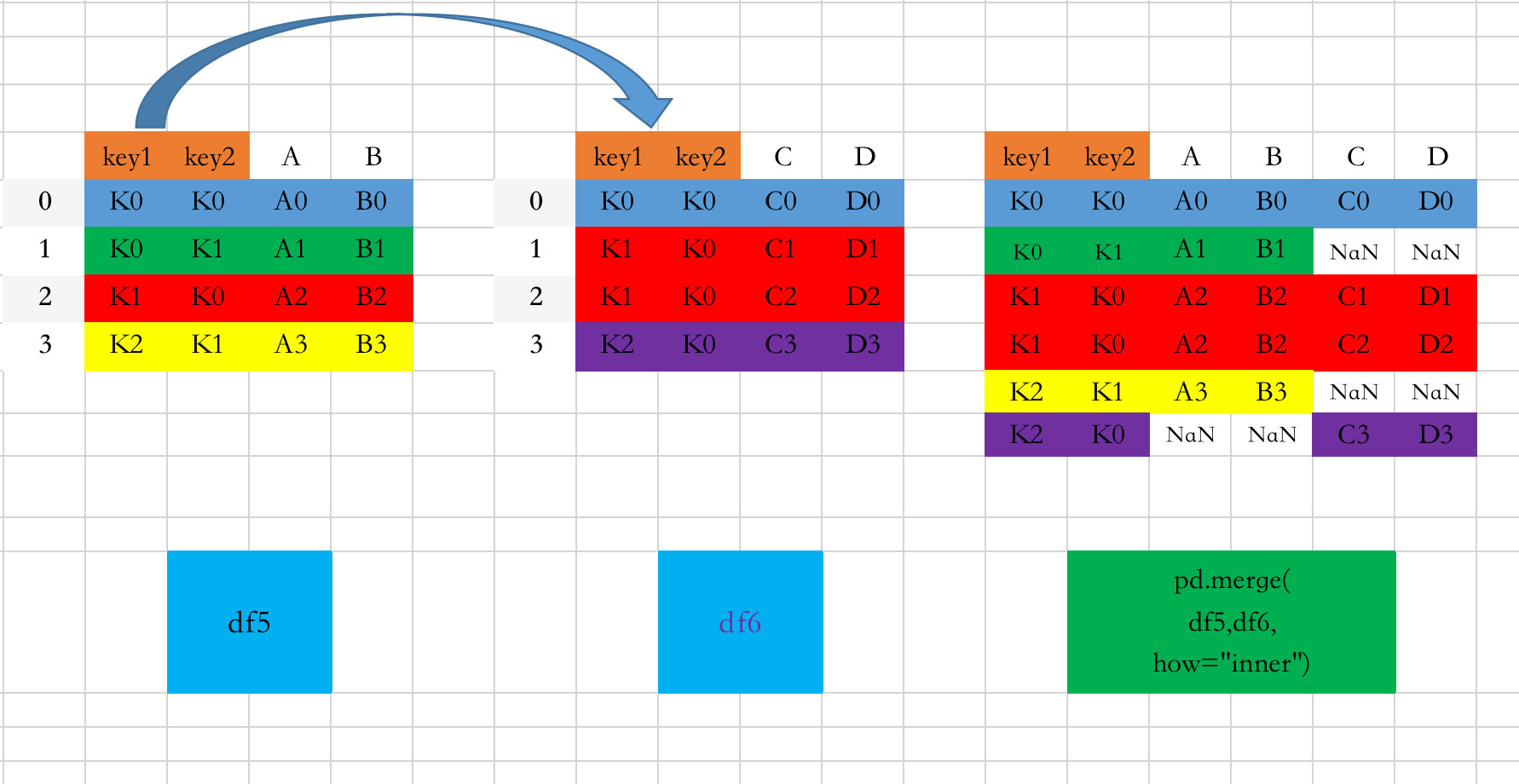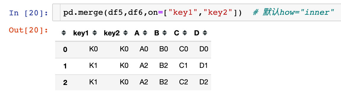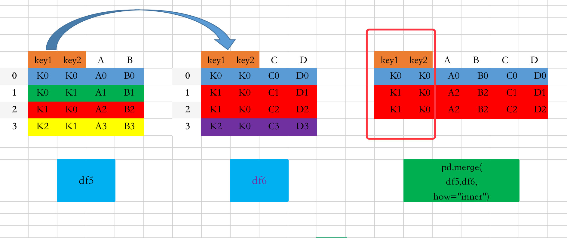 - 只有当两个数据框中的key1和key2的取值完全相同的时候(交集),才会保留下来;比如都出现了key1=K0,key2=K0和key1=K1,key2=K0。