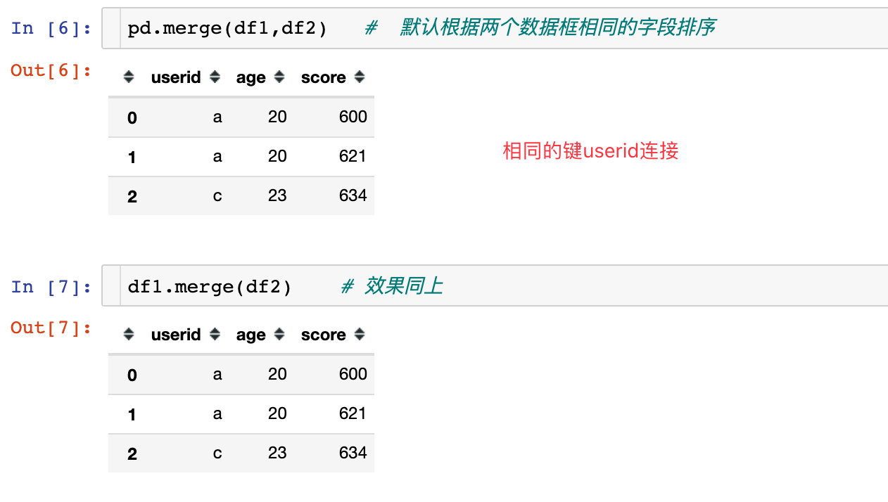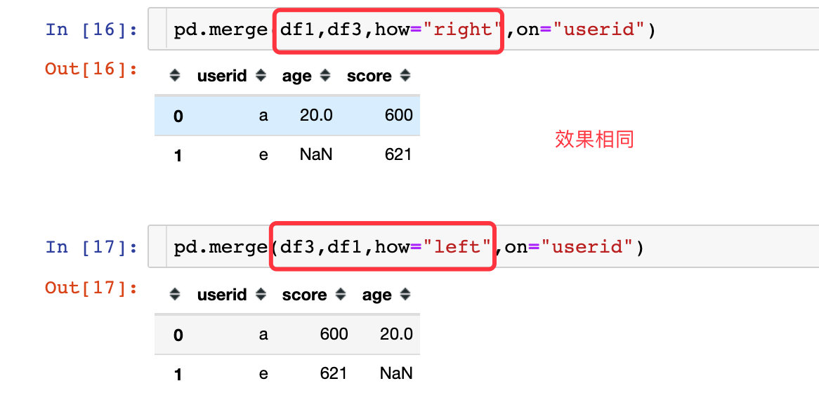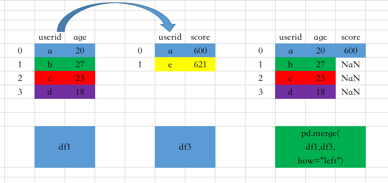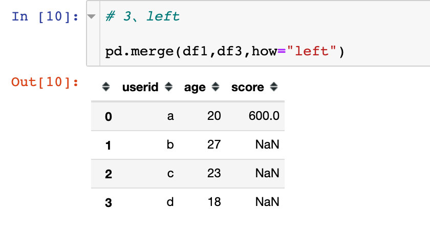 - 如果某边不存在键下面的某个值,则结果中用NaN补充。比如df1的userid中存在b,但是df3中不存在,则结果b对应的score为NaN,cd类似;e在df3中存在e的取值,但是df1中不存在,则age的值为NaN