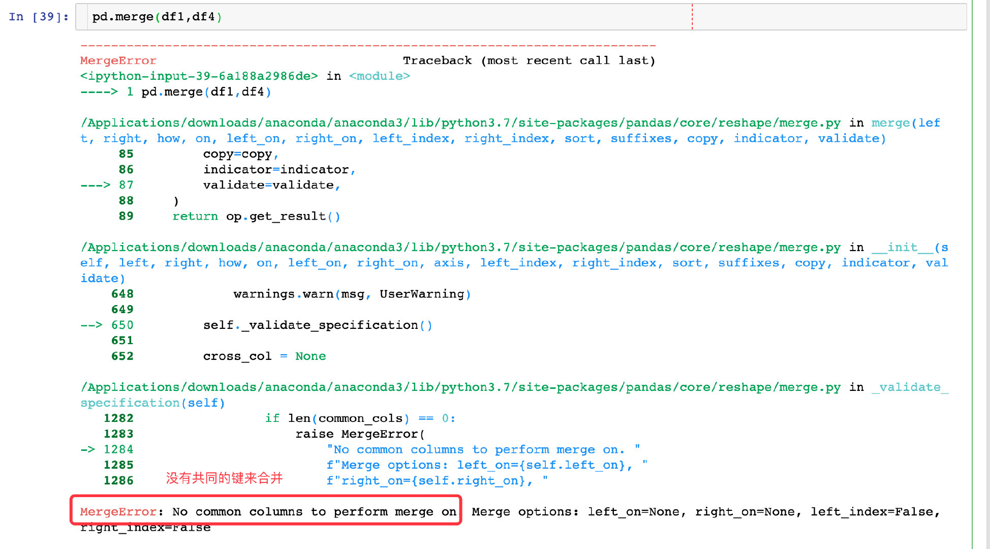 如果我们不指定,系统就会报错,因为这两个数据框是没有相同的键,本身是无法连接的: