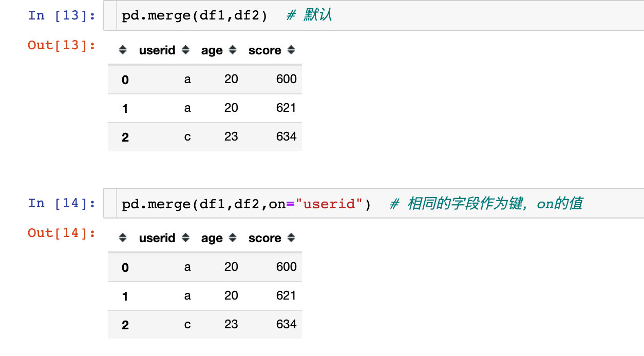 pd.merge(left, # 待合并的2个数据框right, how='inner', # ‘left’, ‘right’, ‘outer’, ‘inner’, ‘cross’on=None, # 连接的键,默认是相同的键left_on=None, # 指定不同的连接字段:键不同,但是键的取值有相同的内容right_on=None, left_index=False, # 根据索引来连接right_index=False, sort=False, # 是否排序suffixes=('_x', '_y'), # 改变后缀copy=True, indicator=False, # 显示字段来源validate=None)