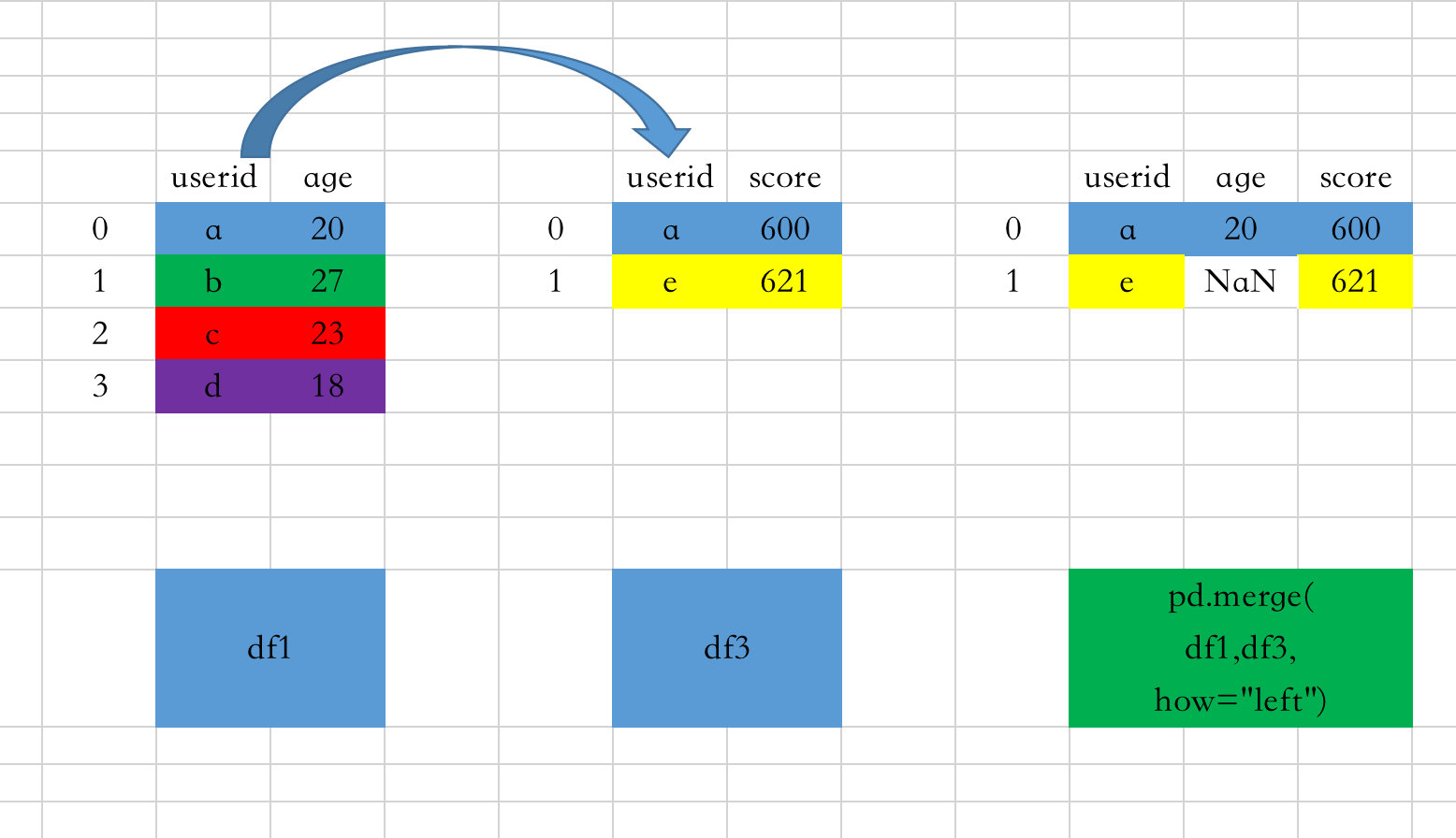以左边数据框中的键为基准;如果左边存在但是右边不存在,则右边用NaN表示