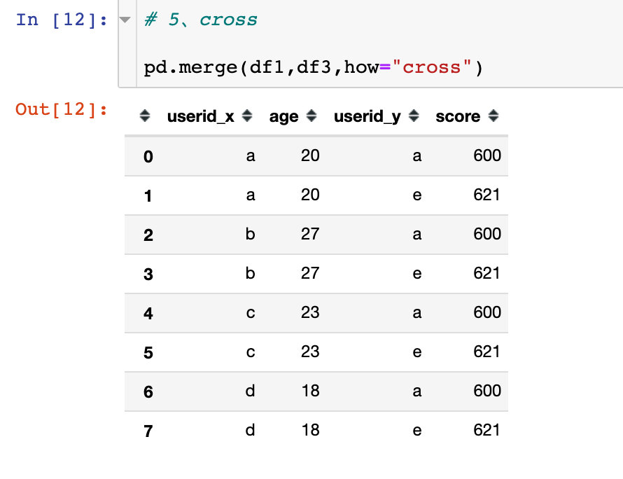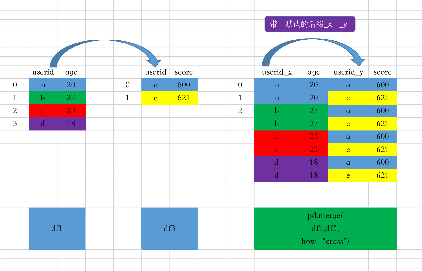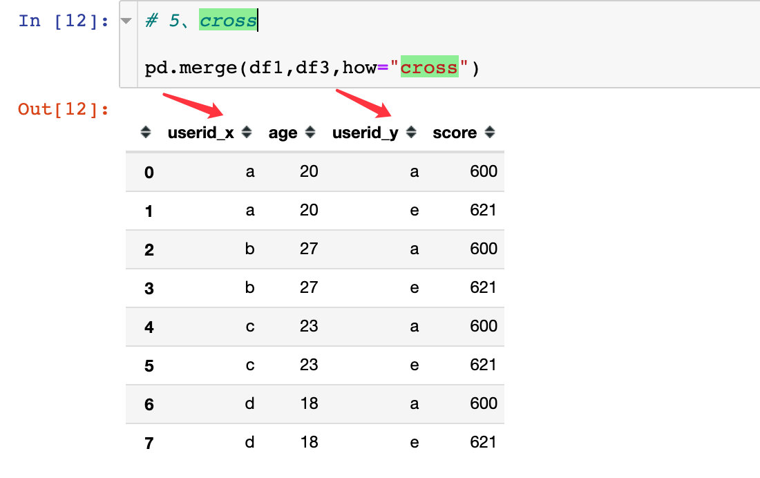 4、cross:创建两个数据帧DataFrame的笛卡尔积,默认保留左边的顺序