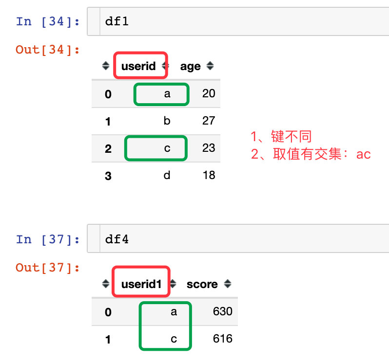 我们创建了4个DataFrame数据框;其中df1和df2、df3是具有相同的键userid;df4有类似的键userid1,取值也是ac,和df1或df2的userid取值有相同的部分。