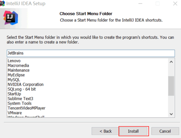 7-选择开始菜单文件夹后,点击 Install 等待安装。