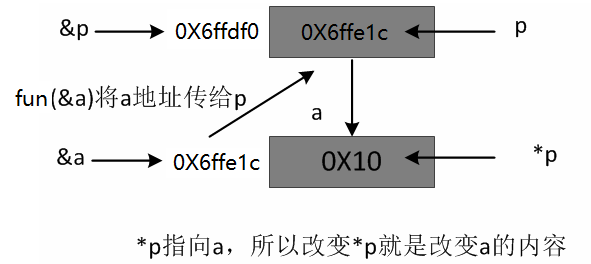 通过指针传递的案例我们可以看到,调用fun(&a)是将a的地址0x6ffe1c传递给p,则*p就指向了a的内容,改变*p后,a的内容自然就改变了,示意图如下: