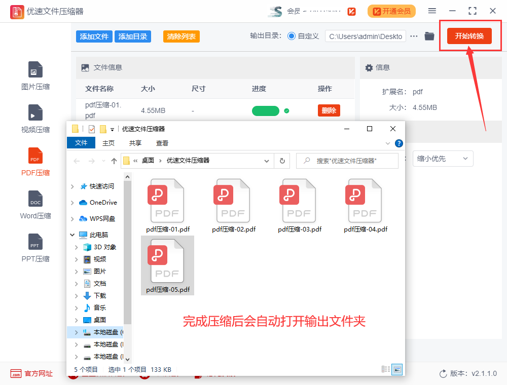 步骤3,设置输出目录,用来老保存压缩后的pdf文件;最后点击【开始转换】按钮,启动软件,完成压缩后软件会自动打开输出文件夹,方便我们进行查看。