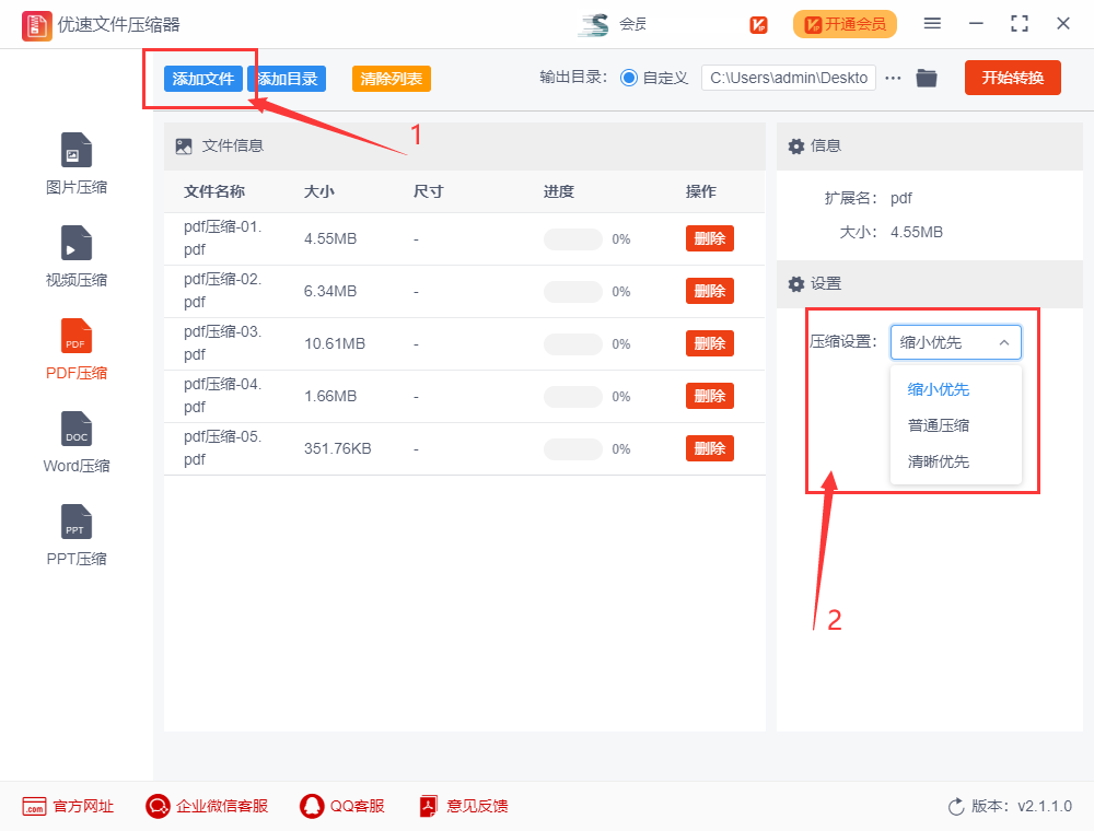 步骤2,点击【添加文件】按钮,将需要压缩变小的pdf文件导入到软件中,支持批量导入及批量压缩,节省时间;然后再进行压缩设置,选择压缩方式。