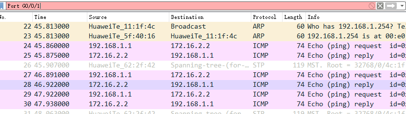 用PC1 ping AR2,分别在接口g0/0/1和接口s4/0/0抓包查看源IP地址: