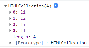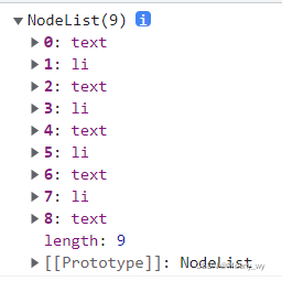 <body><ul><li>1</li><li>2</li><li>3</li><li>4</li></ul><script>var parent = document.querySelector('ul');// 返回所有的子节点 包括所有的文本节点和元素节点var lis = parent.childNodes;console.log(lis);</script>