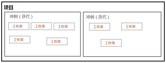 一个项目,可能被拆分为多个冲刺,每个冲刺里的需求,被拆分为多个工作项。