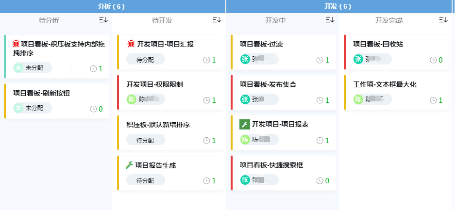 1. 工作项在实际开发拖拽使用时,由于开发人员对单独模块不了解,所以几个项都一并开发(比如,把一个页面拆分成了四个工作项:顶部工具栏、中部banner显示、左侧tab面板、中间状态列。开发人员,在开发时,非先单独开发完【顶部工具栏】,再去开发【中部banner显示】,而是在搭建整个页面时,每项都有涉猎)。造成项目经理在看迭代版(故事墙)时,看到某个开发人员有好几项都在并线开发,然后这几项周期显得很长。