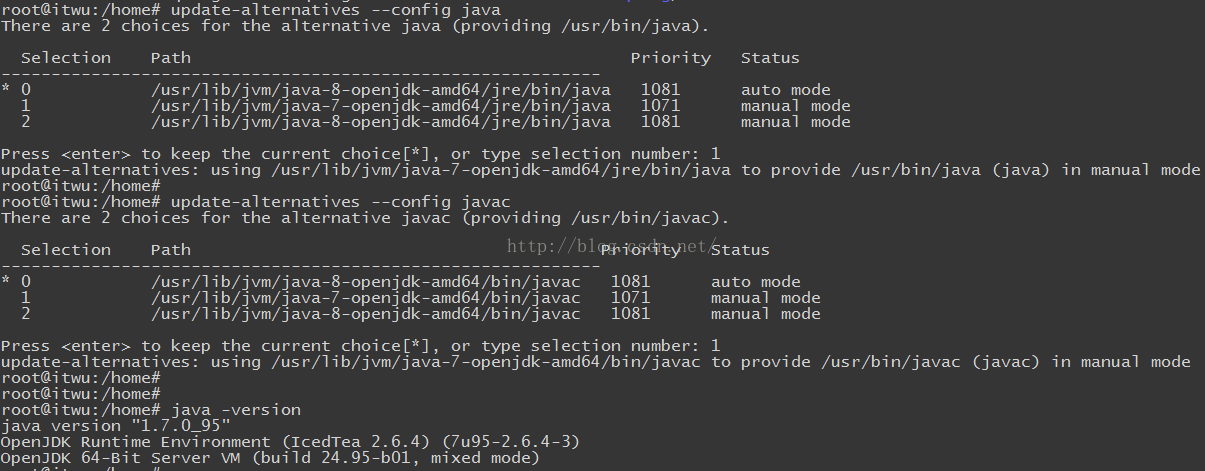 2.3.如果之前你已经安装了openjdk-8-jdk或者是其他版本,那么你需要进行当前使用的JDK版本的切换,如下图所示,执行如下命令,输入对应版本的数字,进行版本切换: