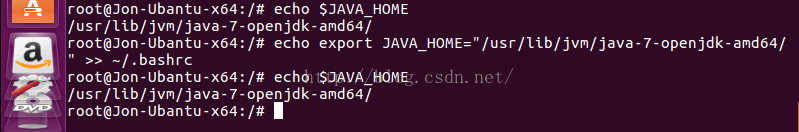 echo export JAVA_HOME="/usr/lib/jvm/java-7-openjdk-amd64/" >> ~/.bashrc