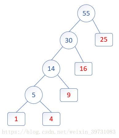 ②选两个最小的加起来成为一个新结点,而这两个最小的值是新结点的左右子结点。
