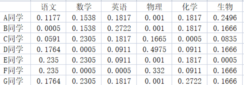 | E同学 | 100 | 100 | 80 | 70 | 90 | 60 |