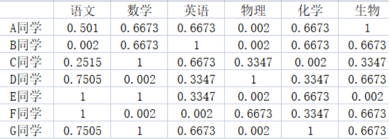 | G同学 | 90 | 100 | 90 | 70 | 100 | 80 |