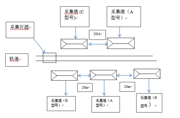 4.在轨道左侧的两个采集堆分别是C型号和A型号的,两个采集堆只见距离30m; 轨道右侧的三个采集堆按照顺序分别是B型号,B型号和C型号,同样每个采集堆之间相距20m。5.采集堆形状附在附录1