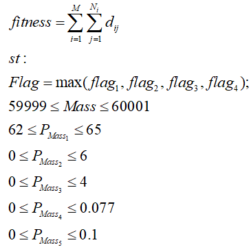 for Num_pso = 4:40%这里没有必要设置太大,设置大了需求量肯定会超过60000,因此,这个值得大小根据需求量来确定,大概范围即可Num_psox = zeros(Num_x,Num_pso);i = 0;%产生能够满足采集规则的随机粒子数据for jj = 1:Num_x%产生随机数的时候,必须是先采集第一层,然后才采集第二层,依次类推%第1层index1 = [1:10,41:50,81:90,121:130,161:170];%第2层index2 = [1:10,41:50,81:90,121:130,161:170]+10;%第3层index3 = [1:10,41:50,81:90,121:130,161:170]+20;%第4层index4 = [1:10,41:50,81:90,121:130,161:170]+30;%根据采集规则产生随机数%根据采集规则产生随机数%根据采集规则产生随机数index = [index1;index2;index3;index4];i = 0;while i < Num_psoi = i + 1;if i> 1for j = 1:50;index(IS(j),ind(1)) = 9999;endendfor j = 1:50;[VS,IS(j)] = min(index(:,j));tmps(1,j) = index(IS(j),j);endind = randperm(40);a(i) = tmps(ind(1));if a(i) == 9999i = i-1;endendx(jj,:) = a; endn = Num_pso; F = fitness_mass(x,maxs_sets,Mass_all);Fitness_tmps1 = F(1);Fitness_tmps2 = 1;for i=1:Num_xif Fitness_tmps1 >= F(i)Fitness_tmps1 = F(i);Fitness_tmps2 = i;endendxuhao = Fitness_tmps2;Tour_pbest = x; %当前个体最优Tour_gbest = x(xuhao,:) ; %当前全局最优路径Pb = inf*ones(1,Num_x); %个体最优记录Gb = F(Fitness_tmps2); %群体最优记录xnew1 = x;N = 1;while N <= Iteration_sub%计算适应度 F = fitness_mass(x,maxs_sets,Mass_all);for i=1:Num_xif F(i)<Pb(i)%将当前值赋给新的最佳值Pb(i)=F(i); Tour_pbest(i,:)=x(i,:);endif F(i)<GbGb=F(i);Tour_gbest=x(i,:);endendFitness_tmps1 = Pb(1);Fitness_tmps2 = 1;for i=1:Num_xif Fitness_tmps1>=Pb(i)Fitness_tmps1=Pb(i);Fitness_tmps2=i;endendnummin = Fitness_tmps2;%当前群体最优需求量差Gb(N) = Pb(nummin); for i=1:Num_x%与个体最优进行交叉c1 = round(rand*(n-2))+1; c2 = round(rand*(n-2))+1;while c1==c2c1 = round(rand*(n-2))+1;c2 = round(rand*(n-2))+1;end chb1 = min(c1,c2);chb2 = max(c1,c2);cros = Tour_pbest(i,chb1:chb2); %交叉区域元素个数ncros= size(cros,2); %删除与交叉区域相同元素for j=1:ncrosfor k=1:nif xnew1(i,k)==cros(j)xnew1(i,k)=0;for t=1:n-ktemp=xnew1(i,k+t-1);xnew1(i,k+t-1)=xnew1(i,k+t);xnew1(i,k+t)=temp;endendendendxnew = xnew1;%插入交叉区域for j=1:ncrosxnew1(i,n-ncros+j) = cros(j);end%判断产生需求量差是否变小masses=0;masses = sum(maxs_sets(xnew1(i,:)));if F(i)>massesx(i,:) = xnew1(i,:);end%与全体最优进行交叉c1 = round(rand*(n-2))+1; c2 = round(rand*(n-2))+1;while c1==c2c1=round(rand*(n-2))+1; c2=round(rand*(n-2))+1;end chb1 = min(c1,c2);chb2 = max(c1,c2);%交叉区域矩阵cros = Tour_gbest(chb1:chb2); %交叉区域元素个数ncros= size(cros,2); %删除与交叉区域相同元素for j=1:ncrosfor k=1:nif xnew1(i,k)==cros(j)xnew1(i,k)=0;for t=1:n-ktemp=xnew1(i,k+t-1);xnew1(i,k+t-1)=xnew1(i,k+t);xnew1(i,k+t)=temp;end endendendxnew = xnew1;%插入交叉区域for j=1:ncrosxnew1(i,n-ncros+j) = cros(j);end%判断产生需求量差是否变小masses=0;masses = sum(maxs_sets(xnew1(i,:)));if F(i)>massesx(i,:)=xnew1(i,:);end%进行变异操作c1 = round(rand*(n-1))+1; c2 = round(rand*(n-1))+1;temp = xnew1(i,c1);xnew1(i,c1) = xnew1(i,c2);xnew1(i,c2) = temp;%判断产生需求量差是否变小masses=0;masses = sum(maxs_sets(xnew1(i,:)));if F(i)>massesx(i,:)=xnew1(i,:);endendFitness_tmps1=F(1);Fitness_tmps2=1;for i=1:Num_xif Fitness_tmps1>=F(i)Fitness_tmps1=F(i);Fitness_tmps2=i;endendxuhao = Fitness_tmps2;L_best(N) = min(F);%当前全局最优需求量Tour_gbest = x(xuhao,:); N = N + 1;end%判断含量是否满足要求for ii = 1:5Fac_tmps(ii) = sum(FAC_sets(Tour_gbest,ii)'.*maxs_sets(Tour_gbest))/sum(maxs_sets(Tour_gbest));endif (Fac_tmps(1) >= Mass1_min & Fac_tmps(1) <= Mass1_max) &...(Fac_tmps(2) >= Mass2_min & Fac_tmps(2) <= Mass2_max) &...(Fac_tmps(3) >= Mass3_min & Fac_tmps(3) <= Mass3_max) &...(Fac_tmps(4) >= Mass4_min & Fac_tmps(4) <= Mass4_max) &... (Fac_tmps(5) >= Mass5_min & Fac_tmps(5) <= Mass5_max)flag(Num_pso-3) = 1;elseflag(Num_pso-3) = 0; endMass_fig(Num_pso-3) = min(L_best);Mass_Index{Num_pso-3}= Tour_gbest ;