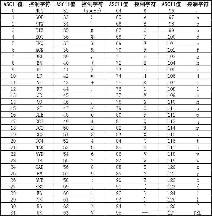 ASCII(American Standard Code for Information Interchange,美国信息互换标准代码)是美国在20世纪60年代制定的一套字符编码标准,主要用于显示美式英语、标准ASCII码使用7位二进制编码表示美式英语中会使用到的控制字符(例如退格、空格)以及可打印字符(例如数字0~9、大小写英文字母、标点符号、运算符号、美元符号),编码范围为0~127(二进制 00000000~01111111)。