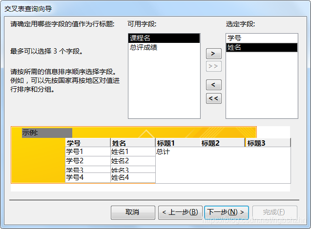 (8)在打开的“请确定用哪些字段的值作为行标题”对话框中,在“可用字段”窗格中,依次双击“学号““姓名¨,这两个字段被发送到“选定字段”的窗格中。