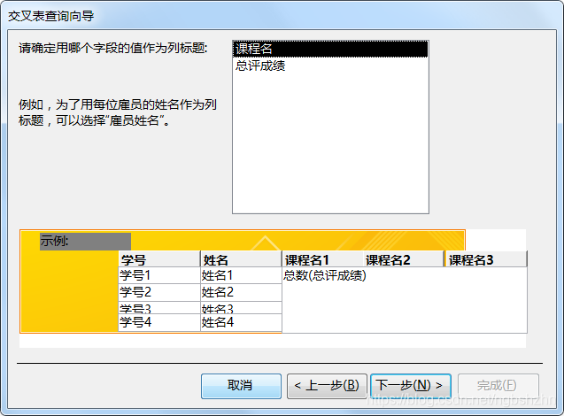 (9)在打开的“请确定用哪个字段的值作为列标题’’对话框中,系统自动选择“课程 名”作为列标题,且“总计”放在计算位置处。
