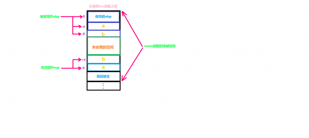 在main函数调用fun函数之前,也就是main的栈帧结构:main函数的栈底ebp,栈顶esp。从低地址esp到高地址ebp,就是main函数的栈帧: