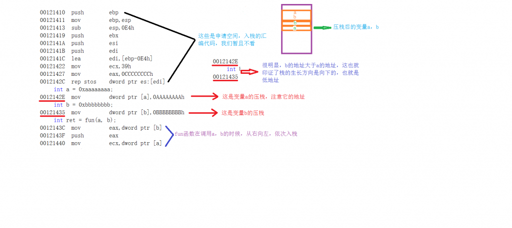 接下来,首先看一下变量压栈的次序以及对应的汇编代码: