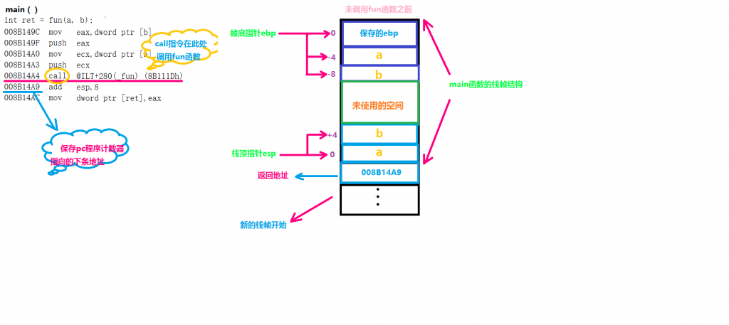 从代码和图中不难看出,在main函数里面,地址为008B14A4 的call指令调用函数fun,其中指明了栈帧esp和程序计算器pc的值,call指令随即将返回地址008B14A9压栈,并跳转到fun的第一条指令。到此main栈帧结束。
