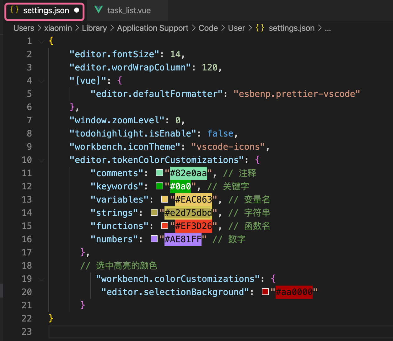 "editor.tokenColorCustomizations": {// "comments": "#82e0aa", // 注释// "keywords": "#0a0", // 关键字// "variables": "#EAC863", // 变量名// "strings": "#e2d75dbd", // 字符串"functions": "#EF3D26", // 函数名// "numbers": "#AE81FF" // 数字},// 选中高亮的颜色"workbench.colorCustomizations": {// "editor.selectionBackground": "#aa0000"}