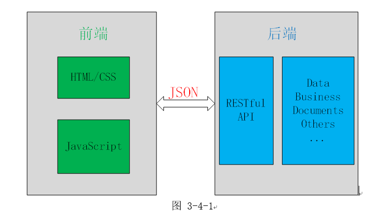 有了REST基础理论,这极大促进了前后端分离各种技术的发展。为了更好的处理传输数据,为了给用户提供更好的使用体验。前后端分离出现了以REST+Json为架构风格的大方向。其实现思想如下图3-4-1所示: