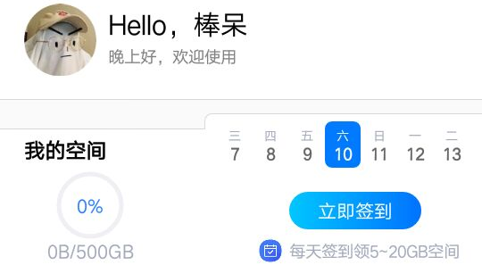 登录后会送500G免费空间,每天签到也会额外赠送5~20G,极少成多嘛!