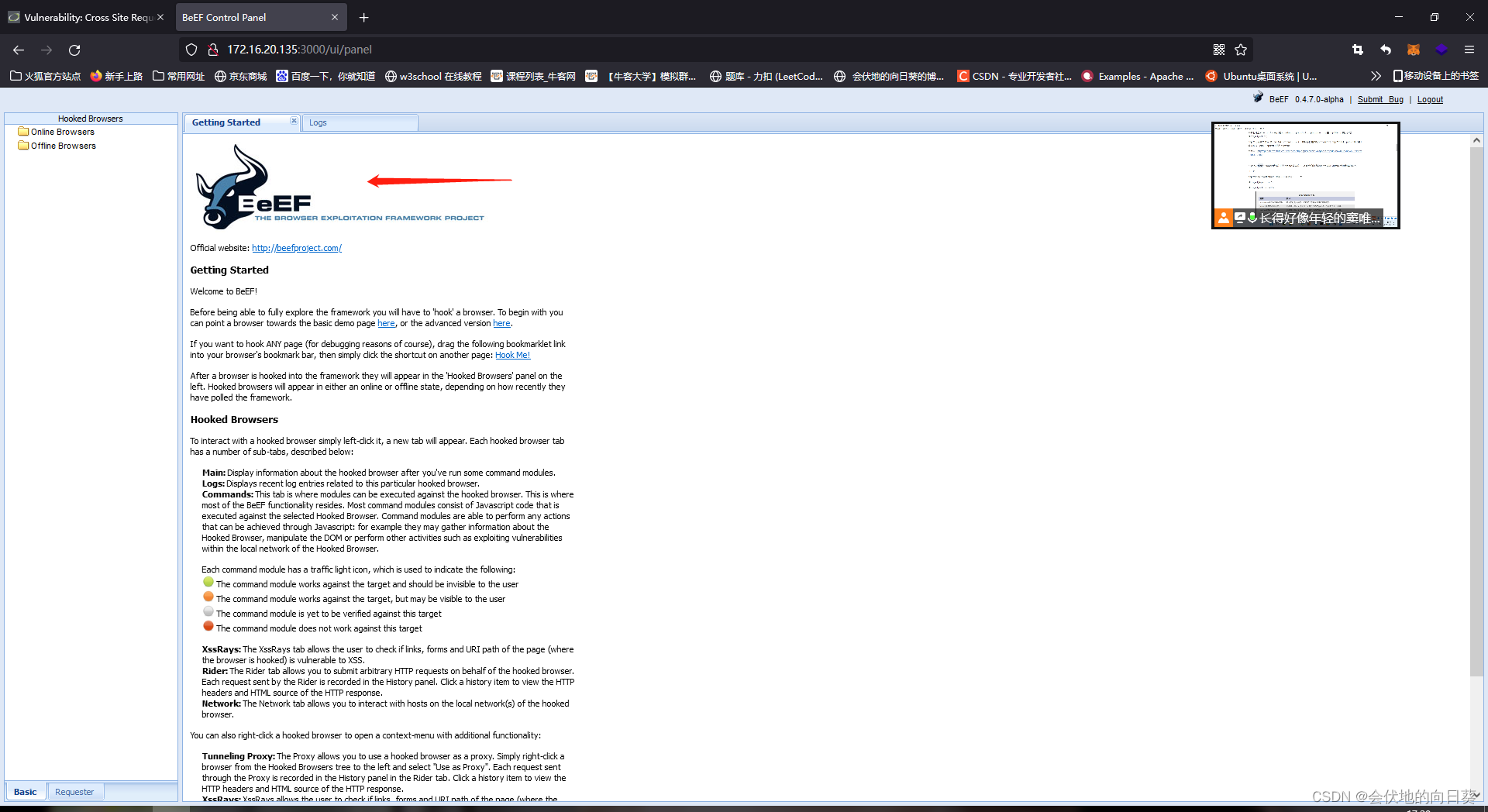 beef平台查看是否抓到用户 ,这里可以看到当用户在无意间访问我们包装的恶意网址时就也就被我们拿下了
