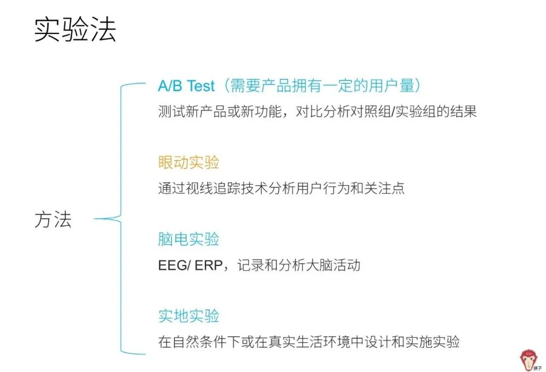 主流的实验法包括A/B Test、眼动实验、脑电实验、实地试验等等。