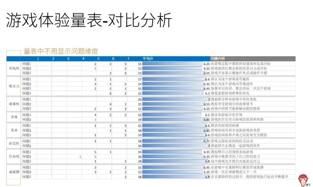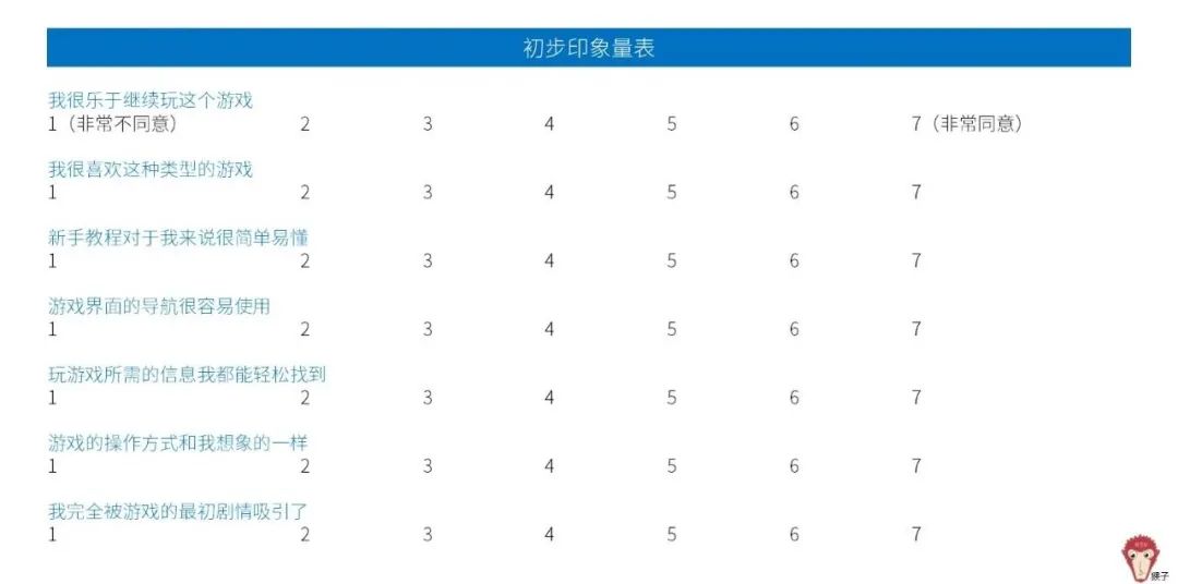游戏体验量表围绕游戏各方面展开:游戏的可玩性、吸引力、故事性、音效美术、社交性、自由度、成就感等。