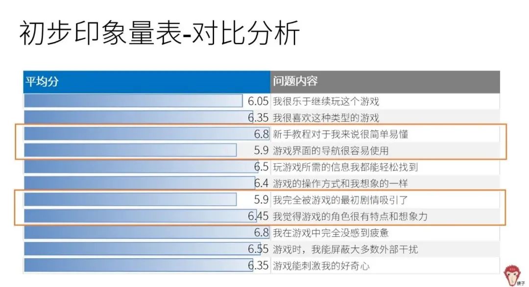 初步印象量表显示,用户对游戏的初印象总体较好,各部分得分都高于5.9分。